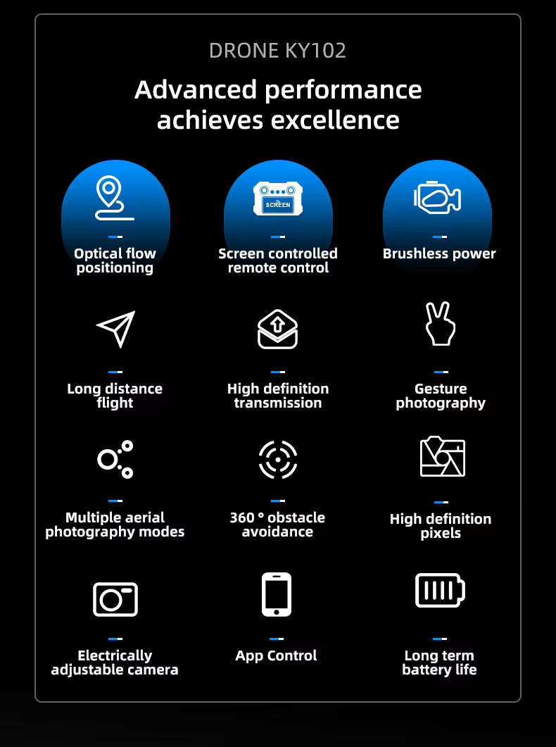 Experience the freedom of flight and unlock your creative potential with the DRONE KY102. Perfect for content creators, photography enthusiasts, and adventure seekers who demand quality and performance.